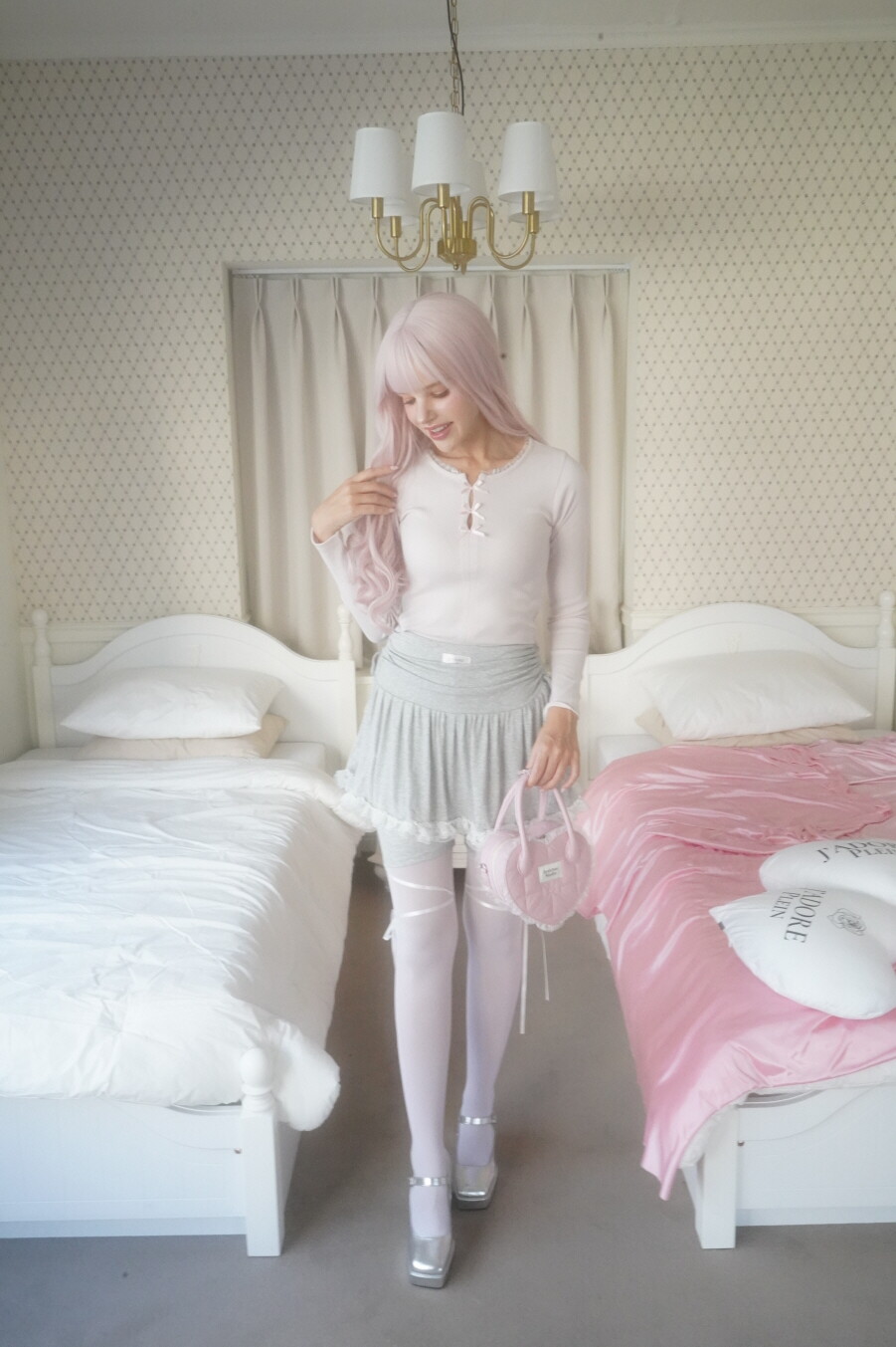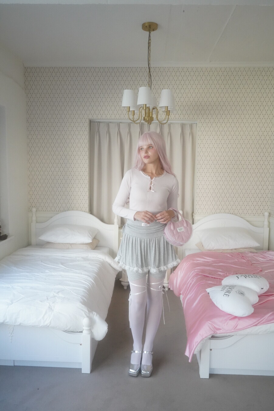 팬츠 밑단의 공단리본을 묶어서 자유롭게 연출할 수 있습니다!