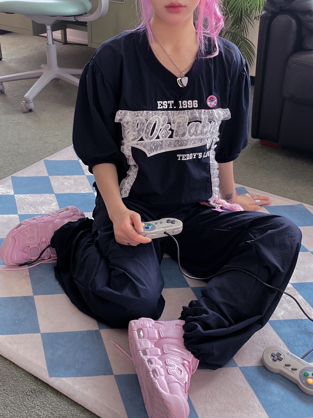 90's Baby Nylon Lace Mtm + Pants Set ( Navy )