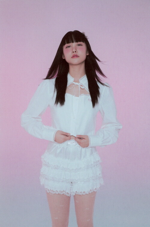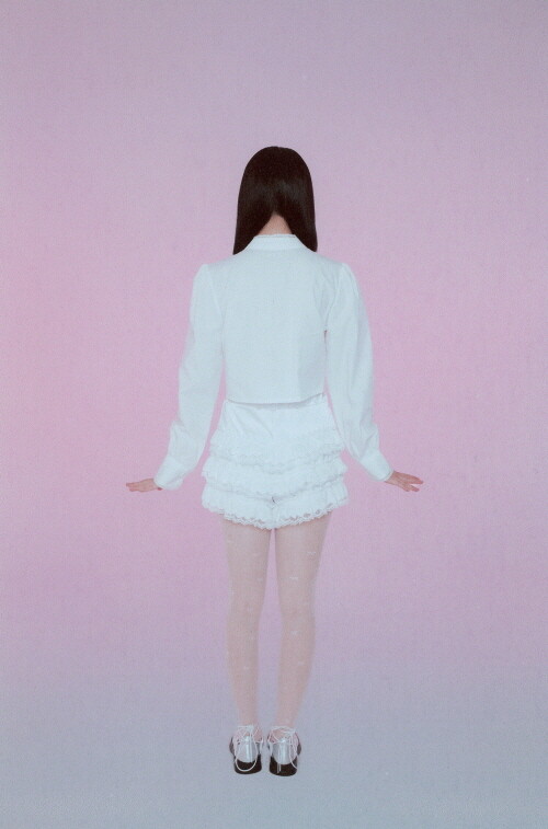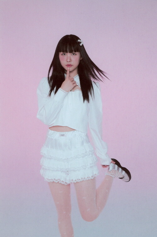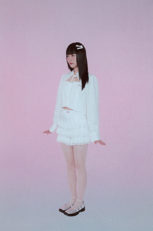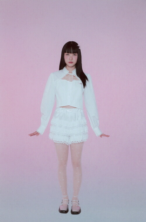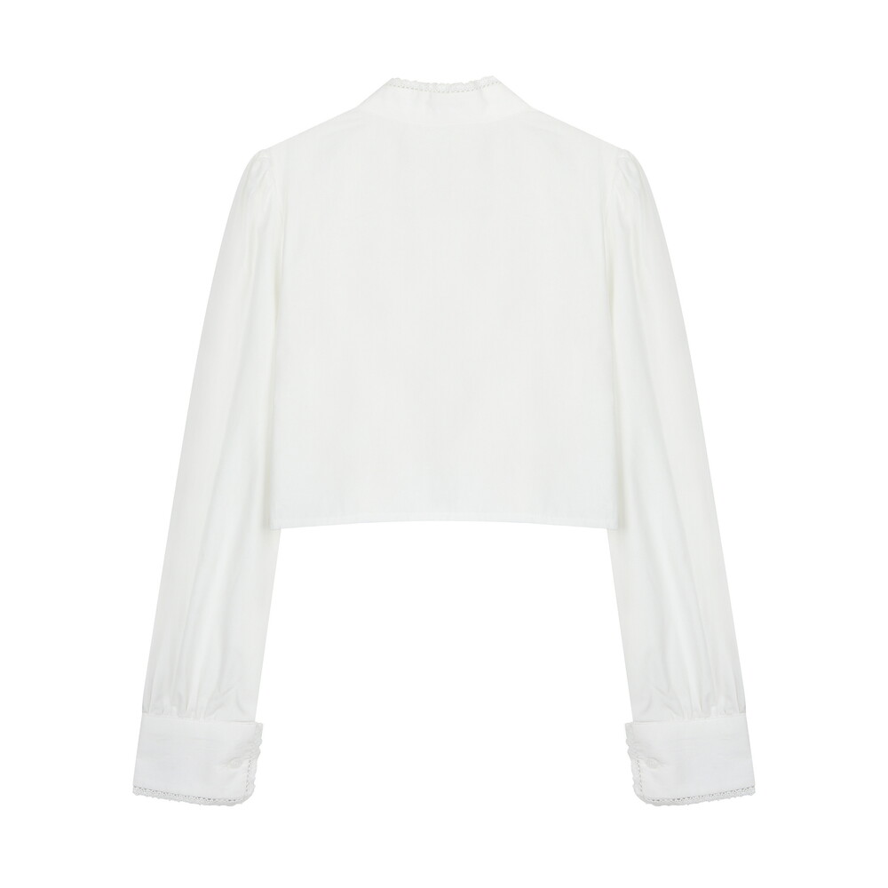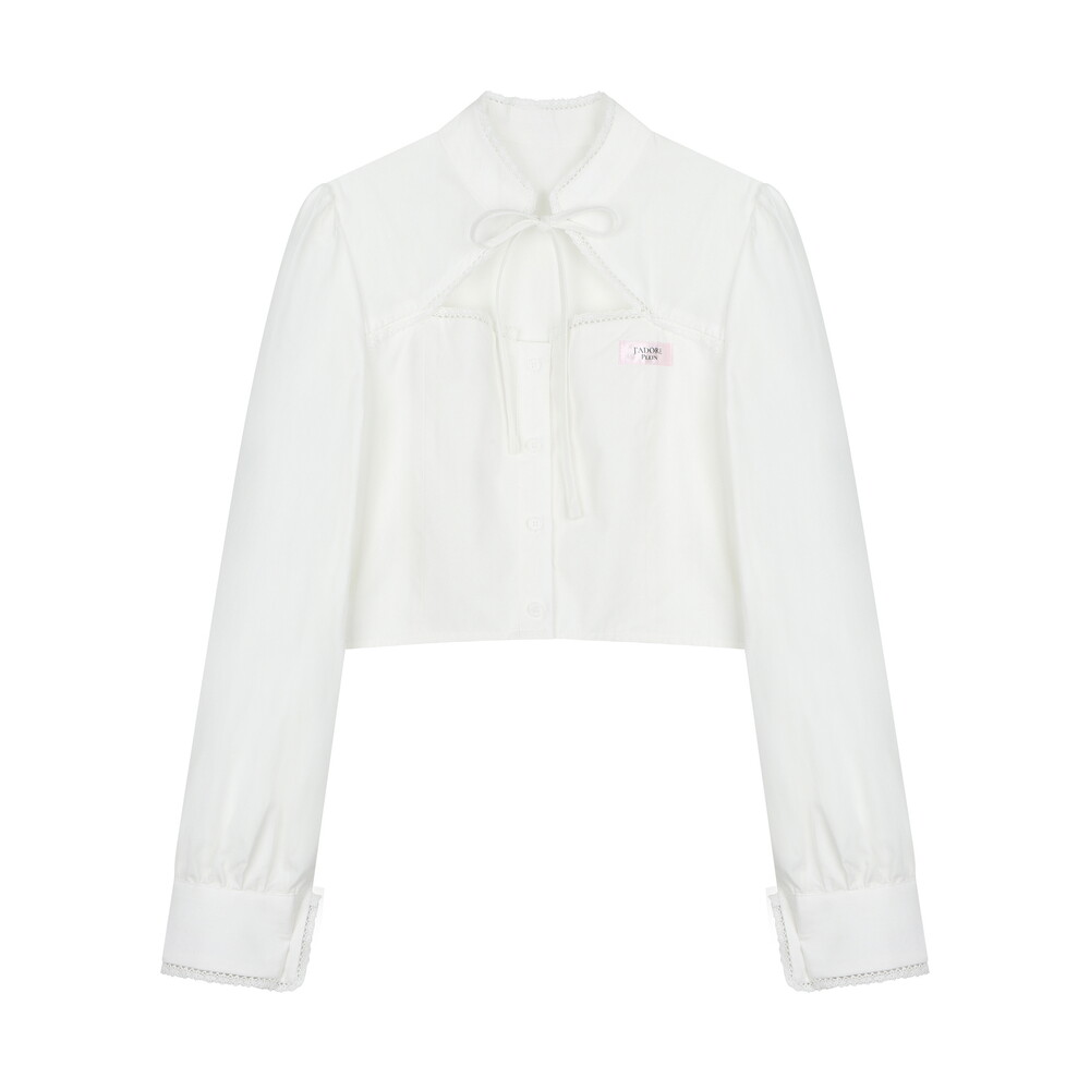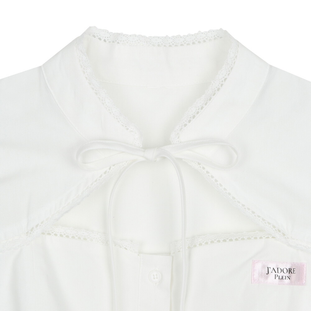 전면부 절개와 리본, 레이스 디테일이 사랑스러운 크롭 블라우스입니다.
