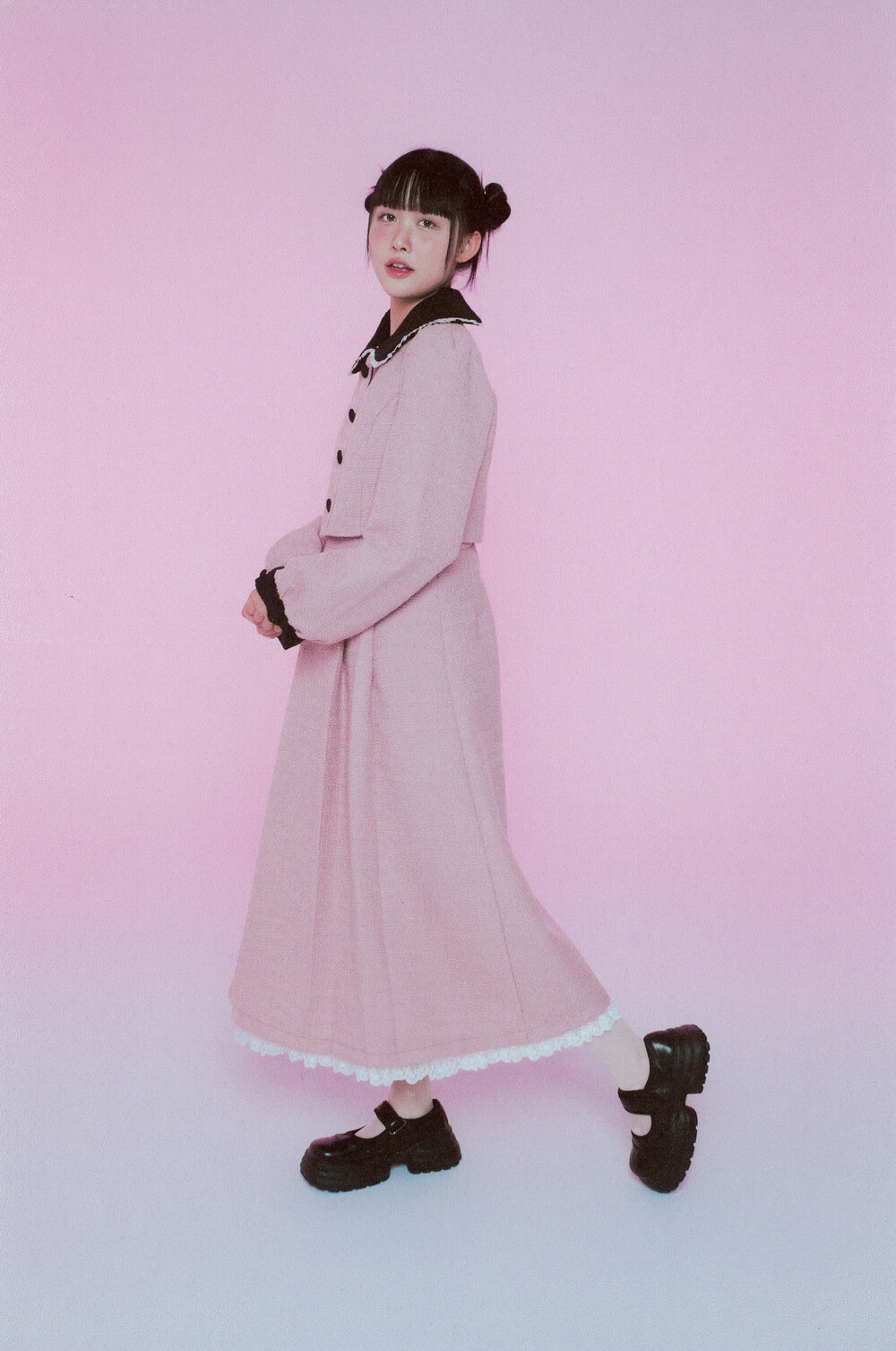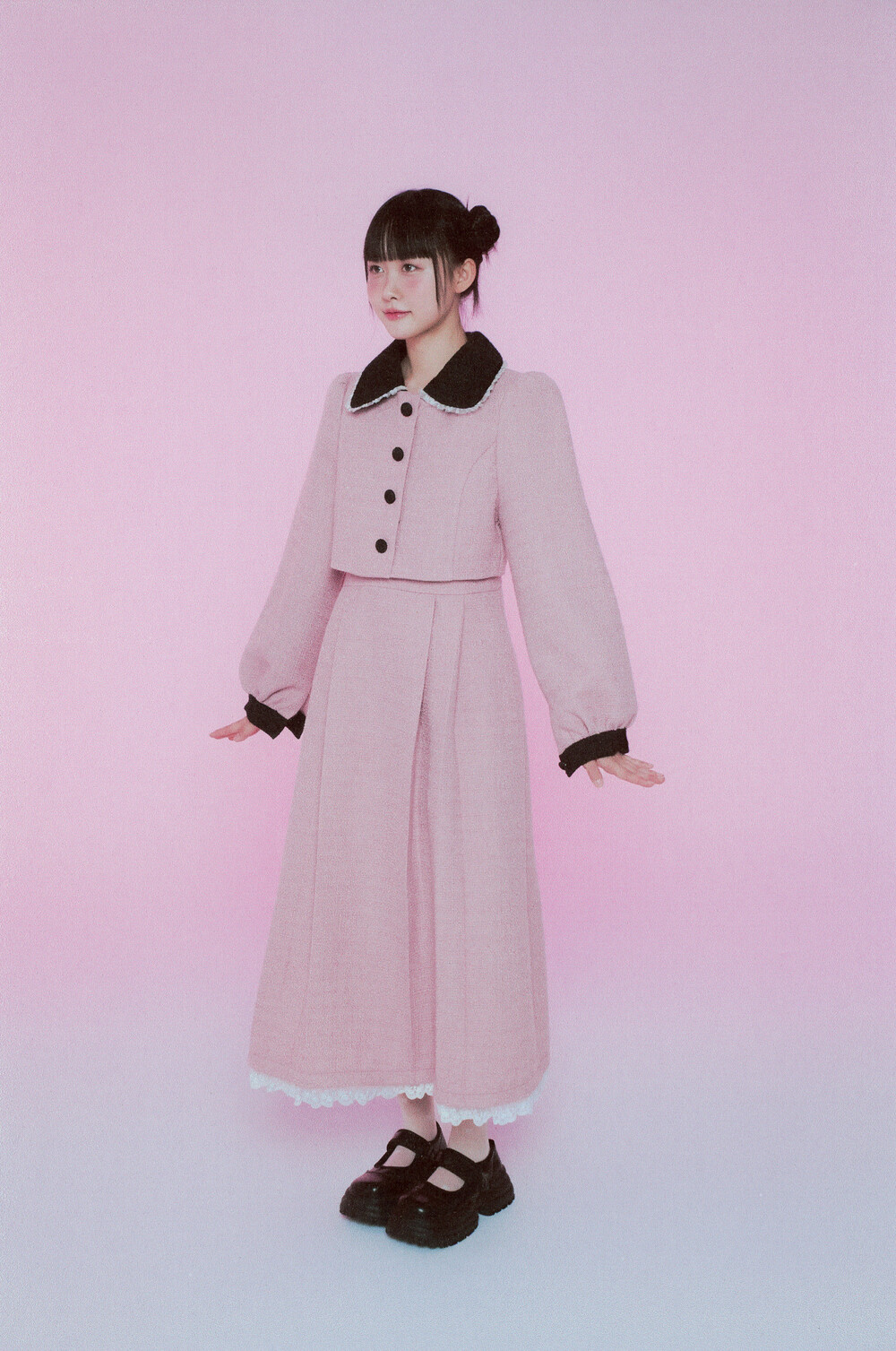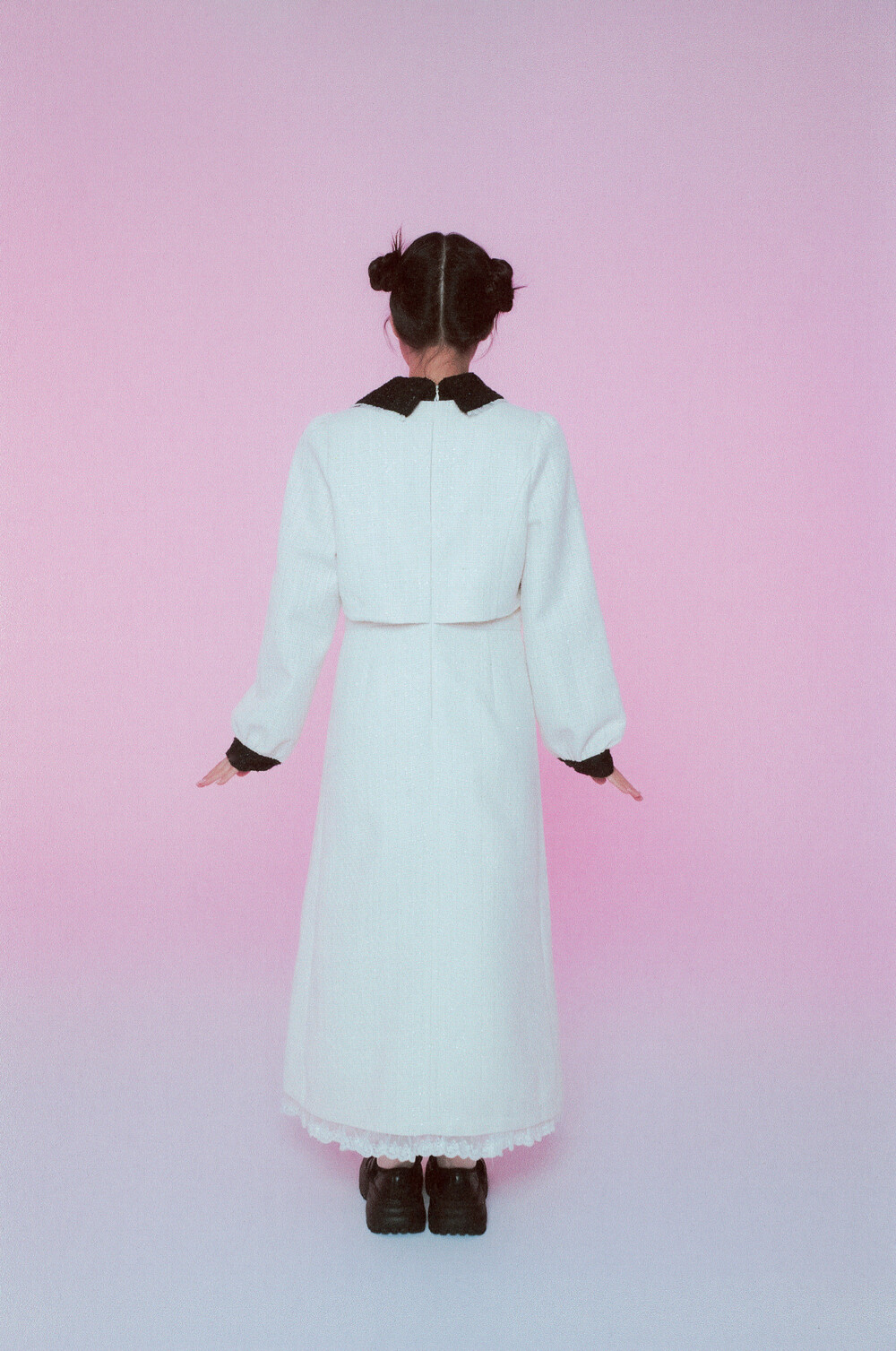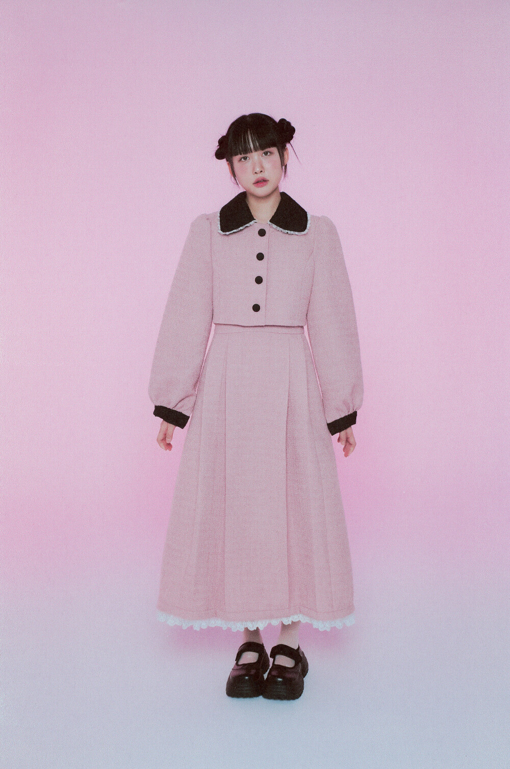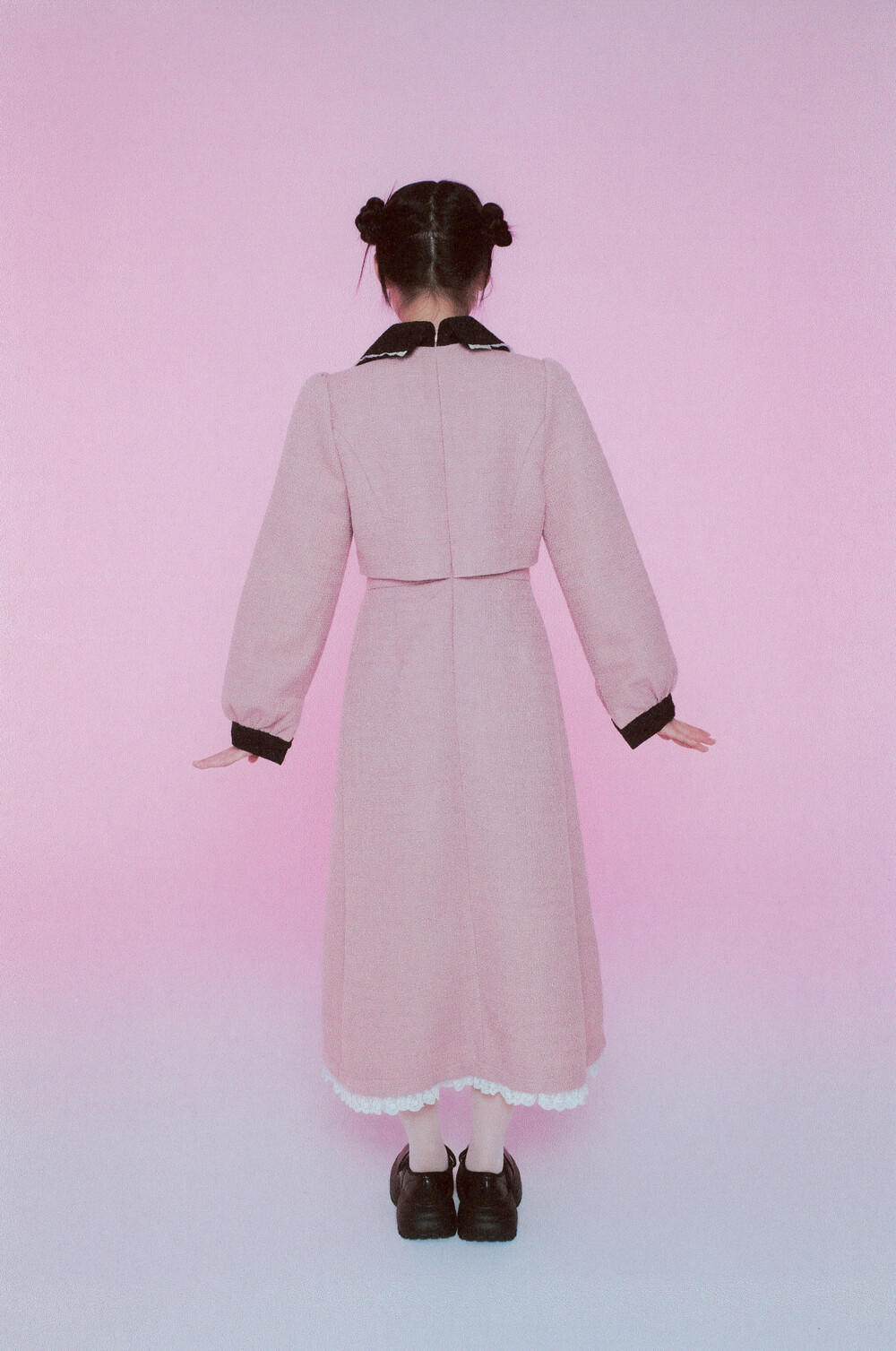 적당한 크기의 라운드 트위드 카라와 레이스 디테일이 더욱 발랄한 무드를 연출해줍니다.