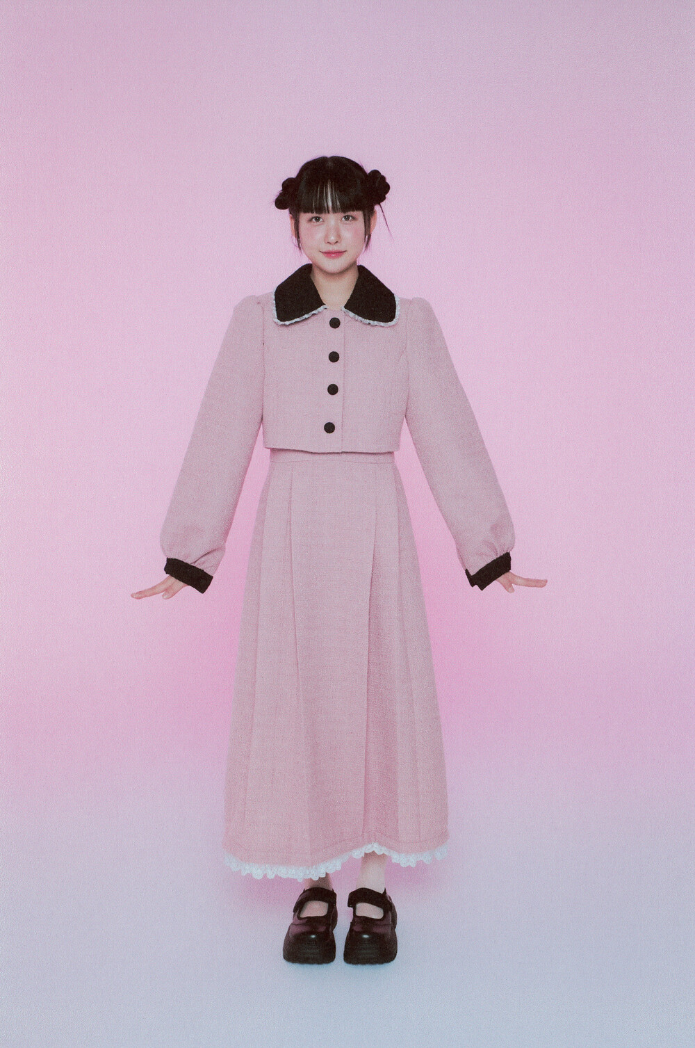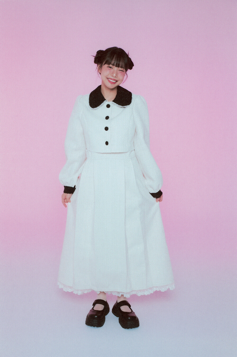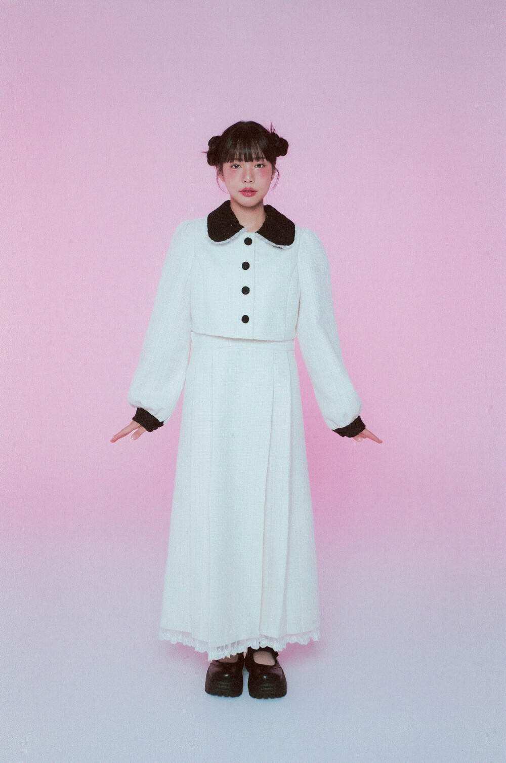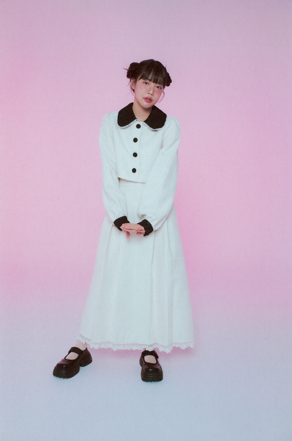 적당한 크기의 라운드 트위드 카라와 레이스 디테일이 더욱 발랄한 무드를 연출해줍니다.