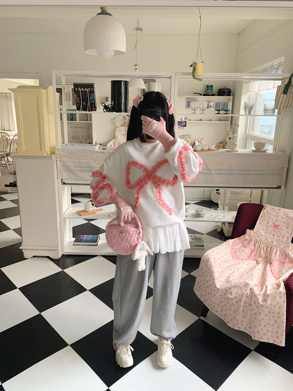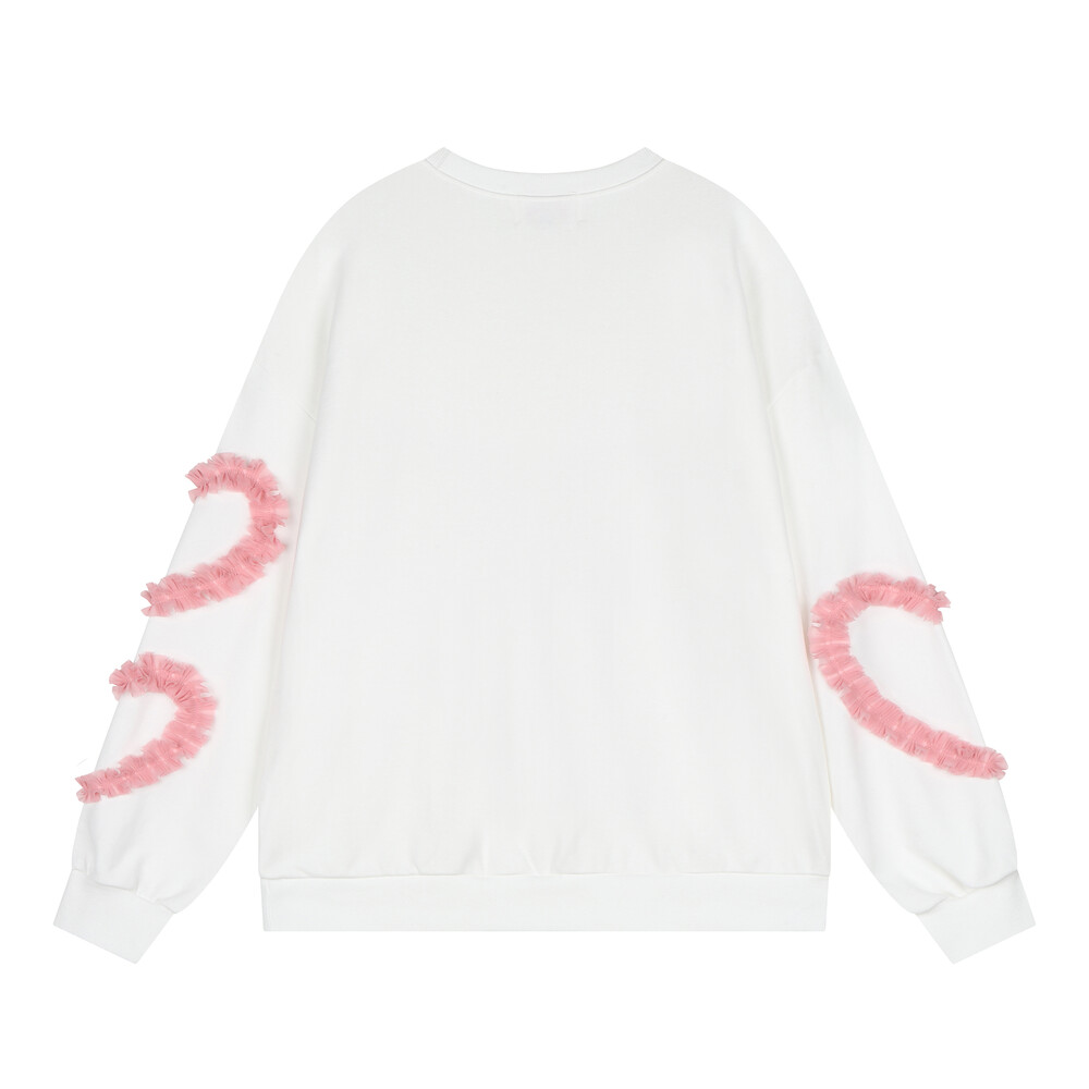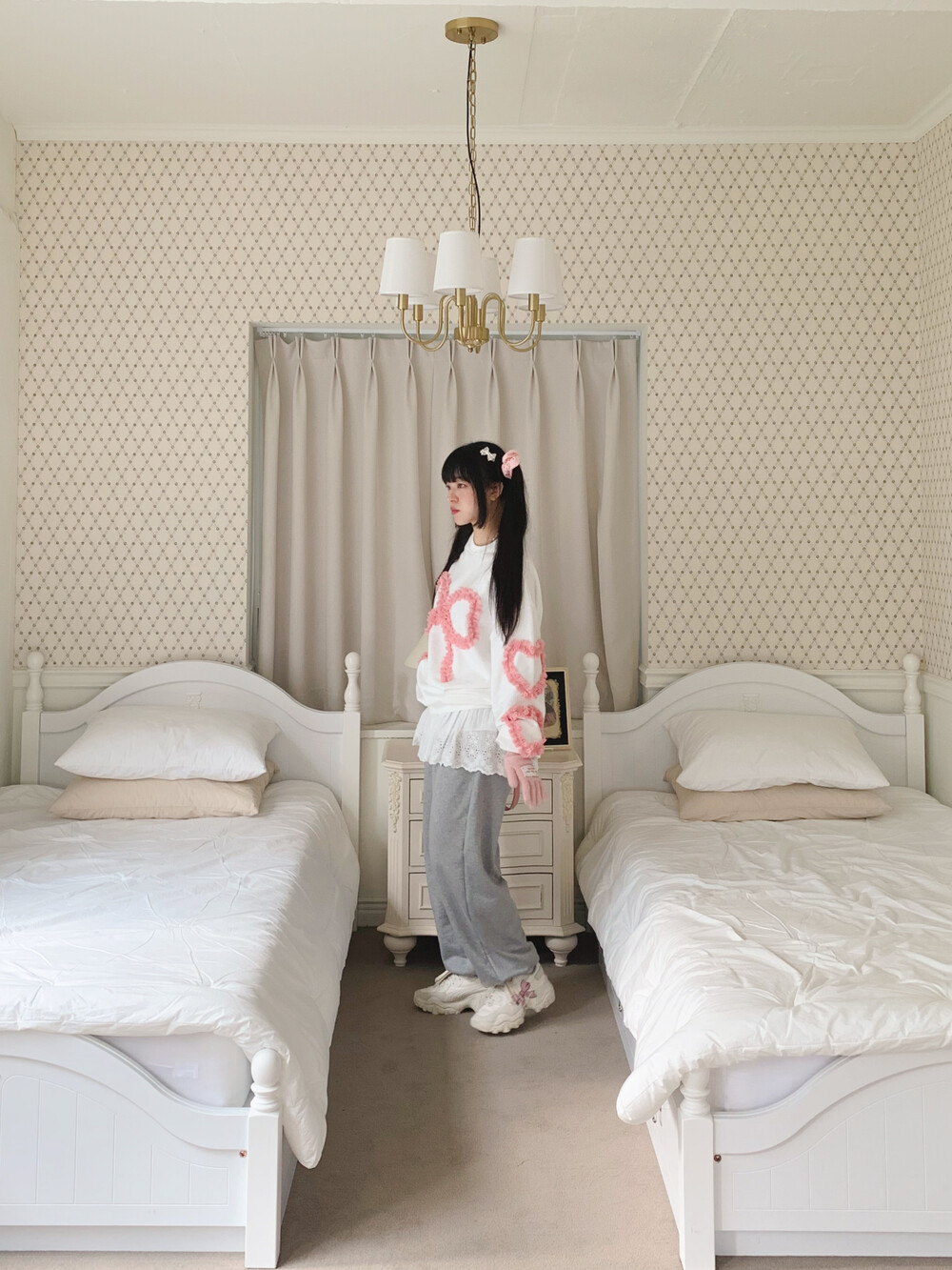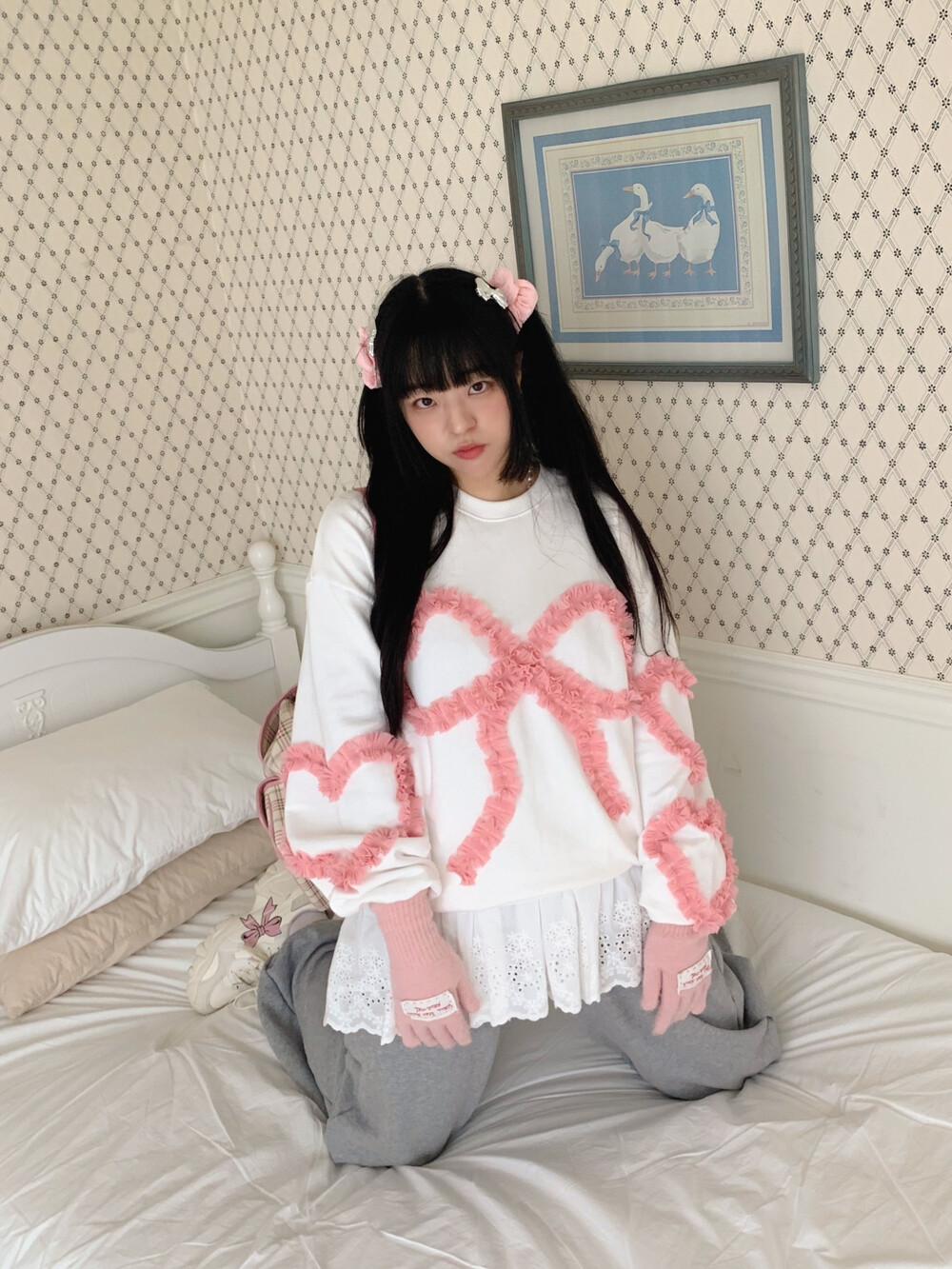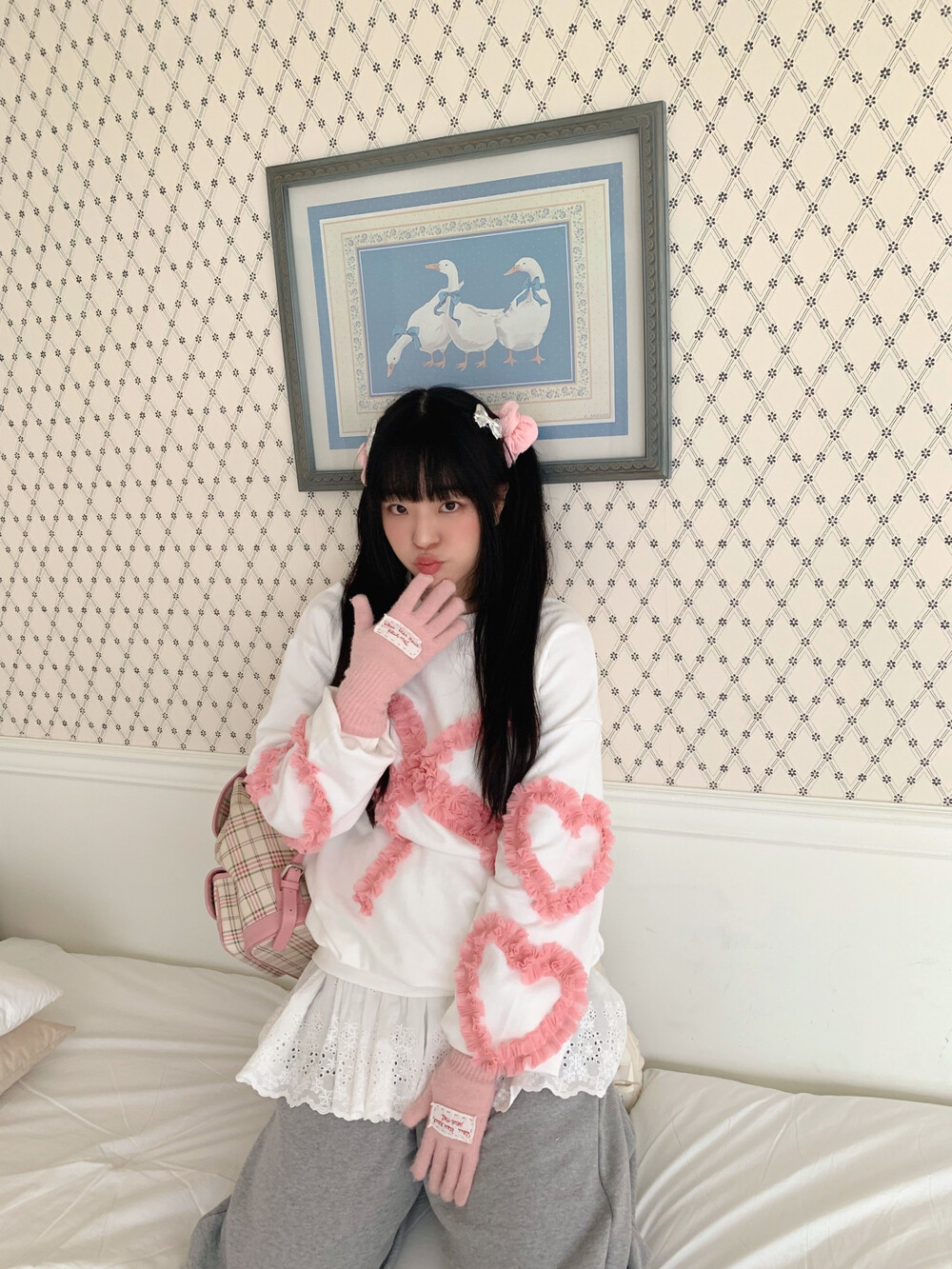 양 팔의 하트가 비대칭으로 들어가 크기도 위치도 다르고 전면 리본 디테일도 레이스를 박아 연출해