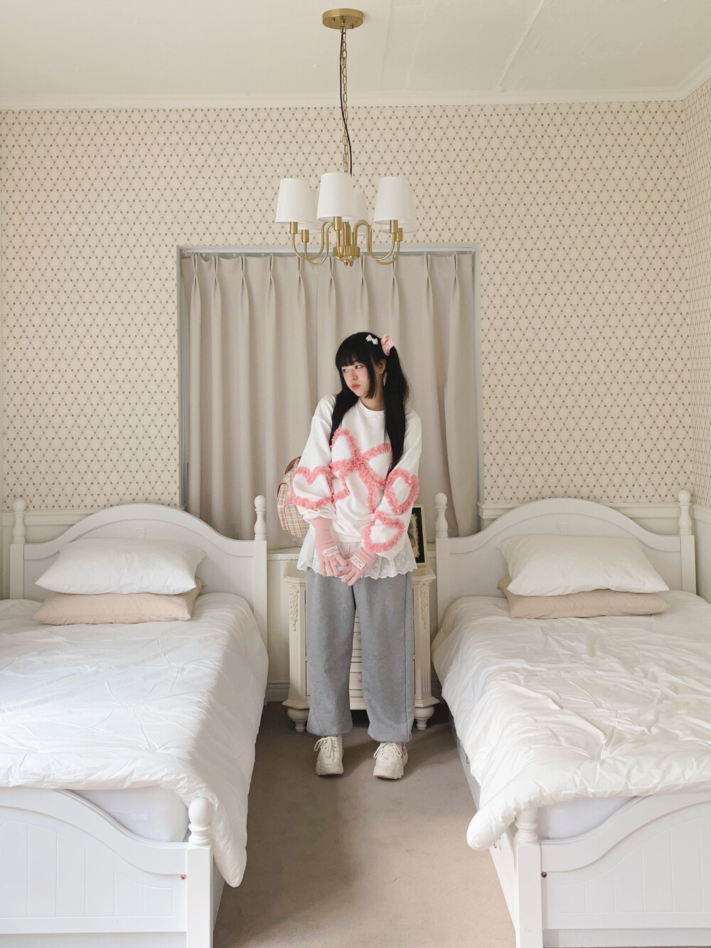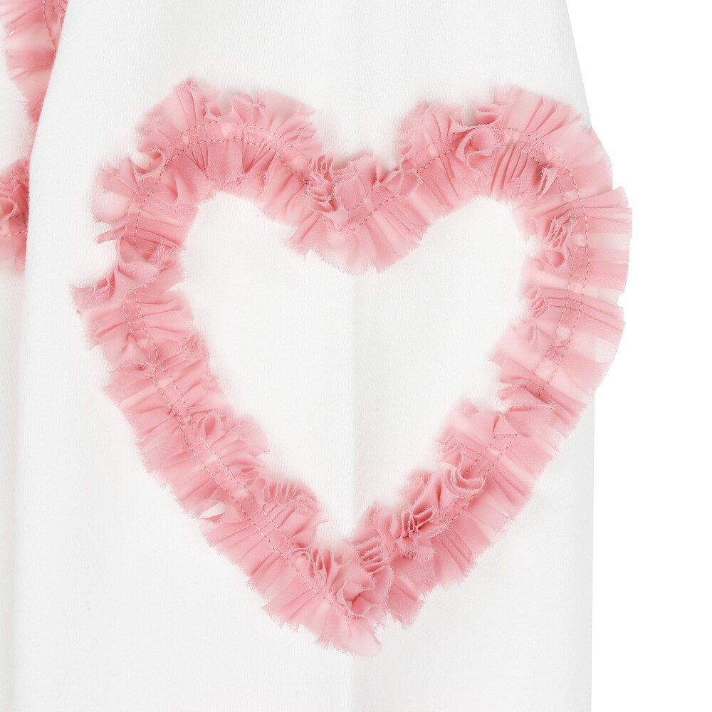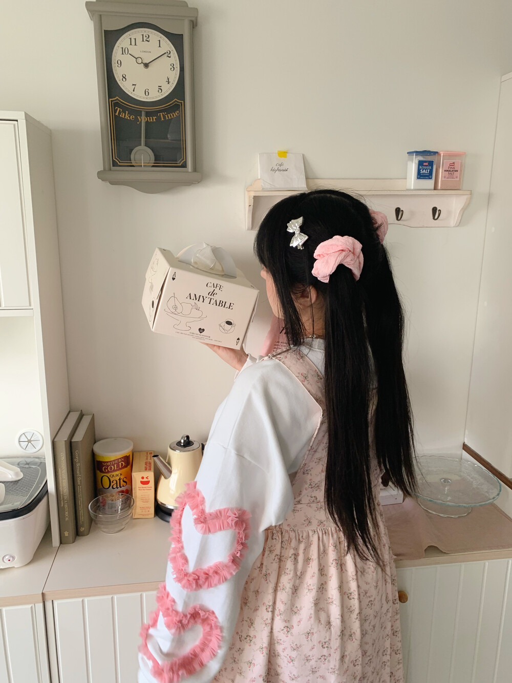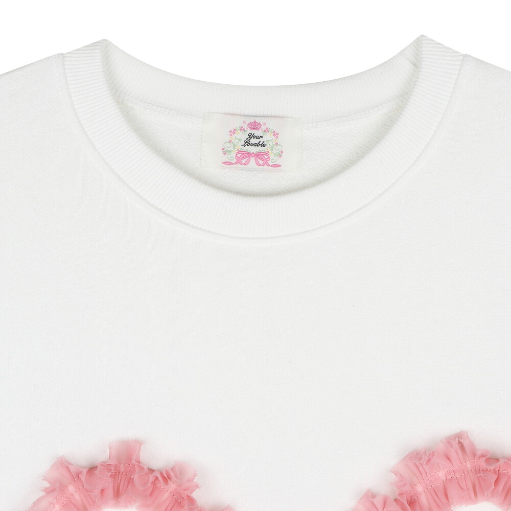 양 팔의 하트가 비대칭으로 들어가 크기도 위치도 다르고 전면 리본 디테일도 레이스를 박아 연출해