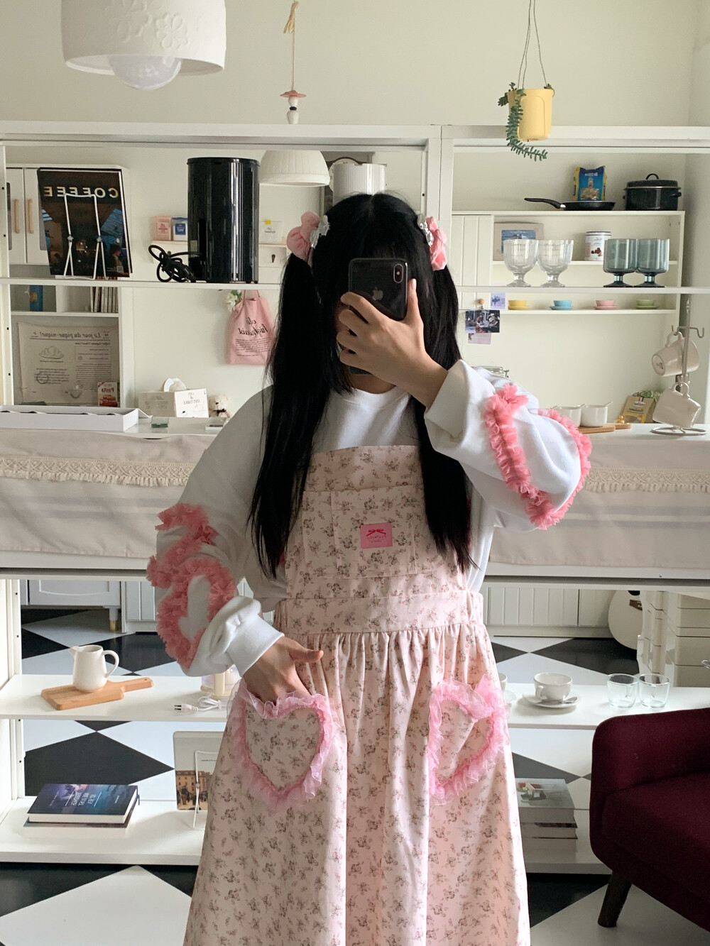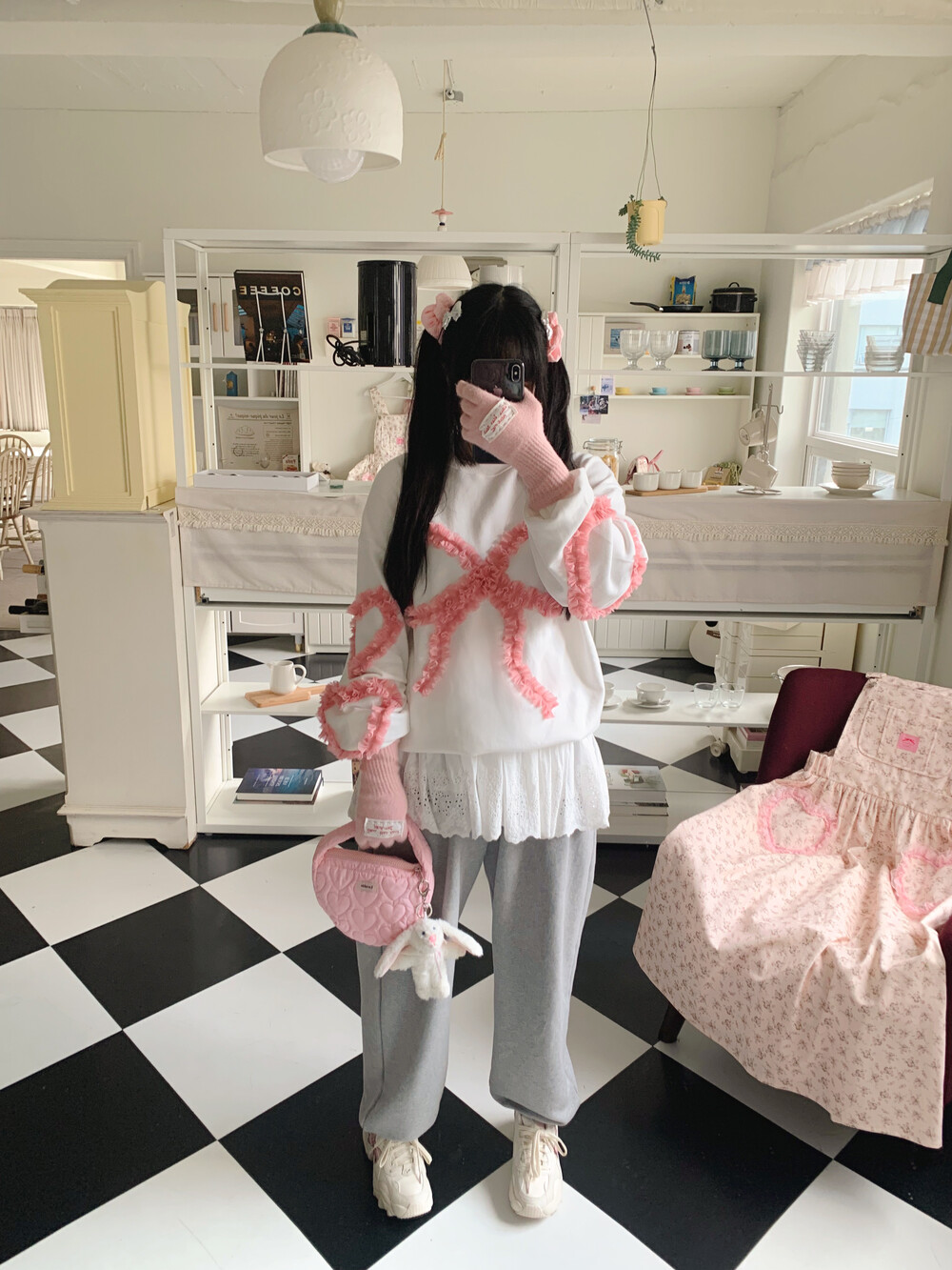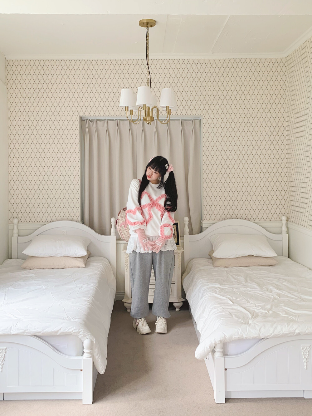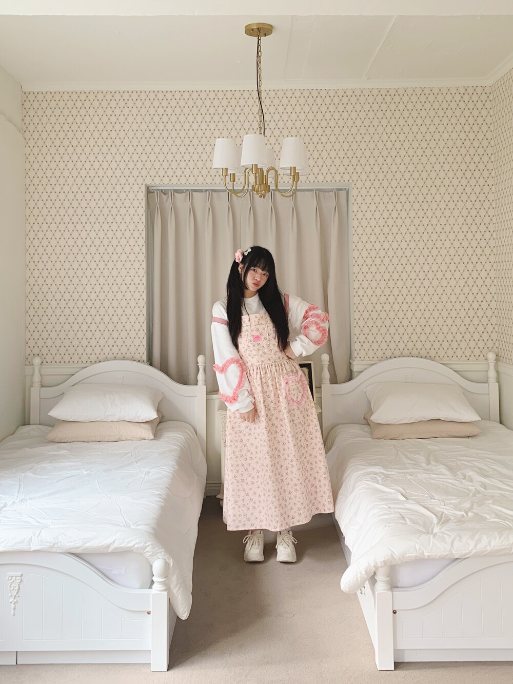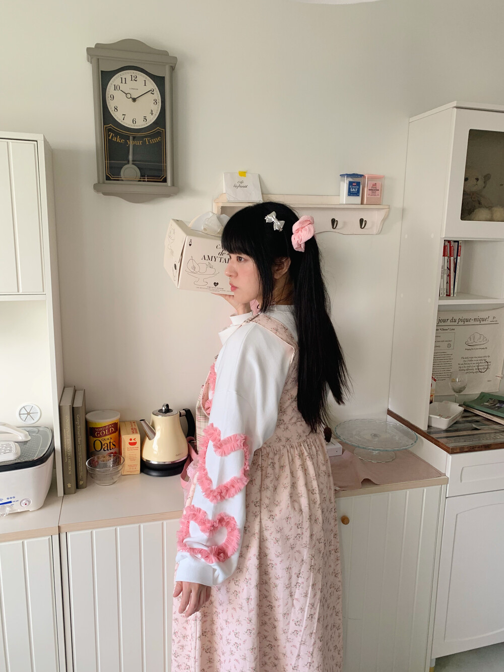 양 팔의 하트가 비대칭으로 들어가 크기도 위치도 다르고 전면 리본 디테일도 레이스를 박아 연출해