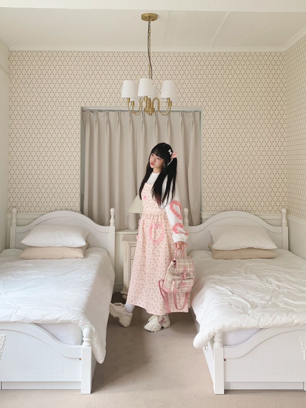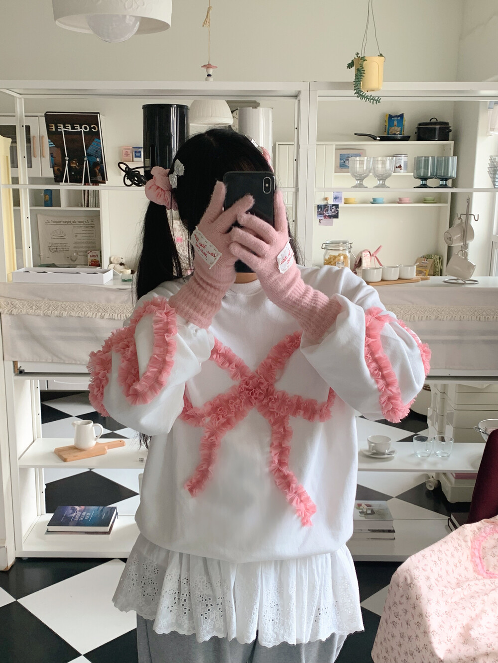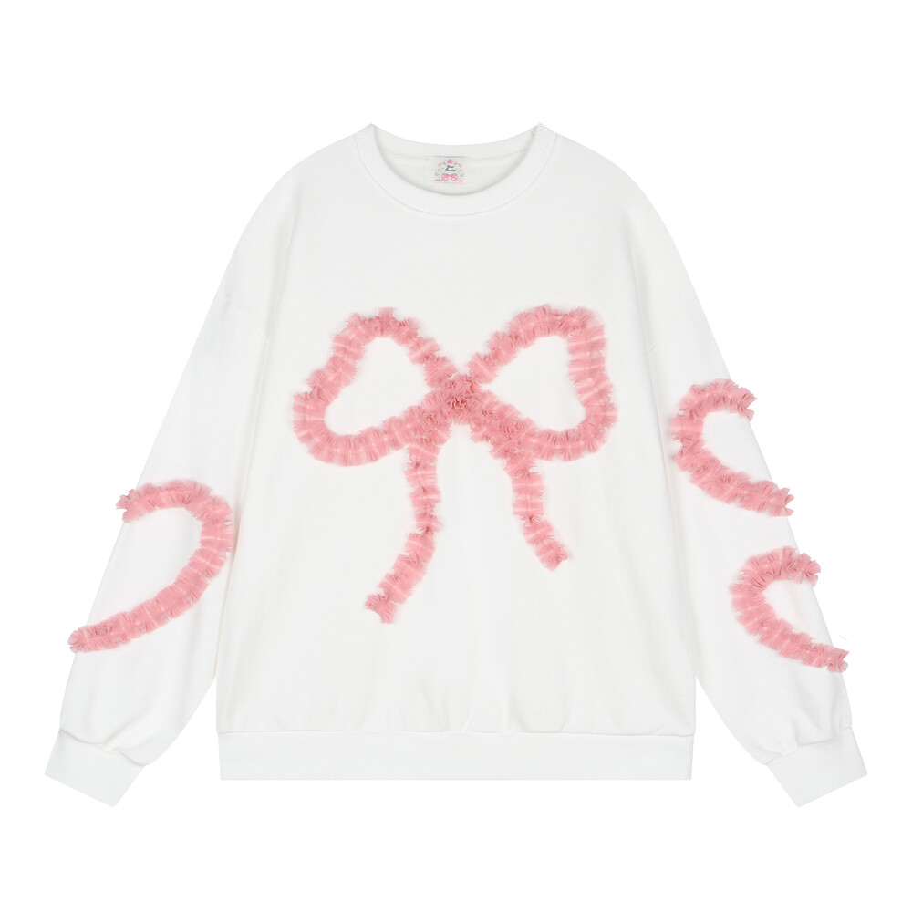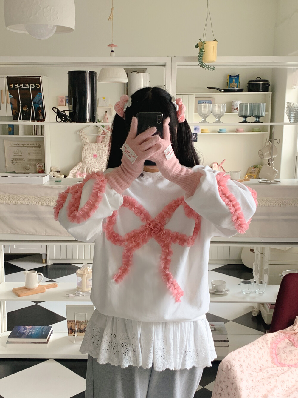 양 팔의 하트가 비대칭으로 들어가 크기도 위치도 다르고 전면 리본 디테일도 레이스를 박아 연출해
